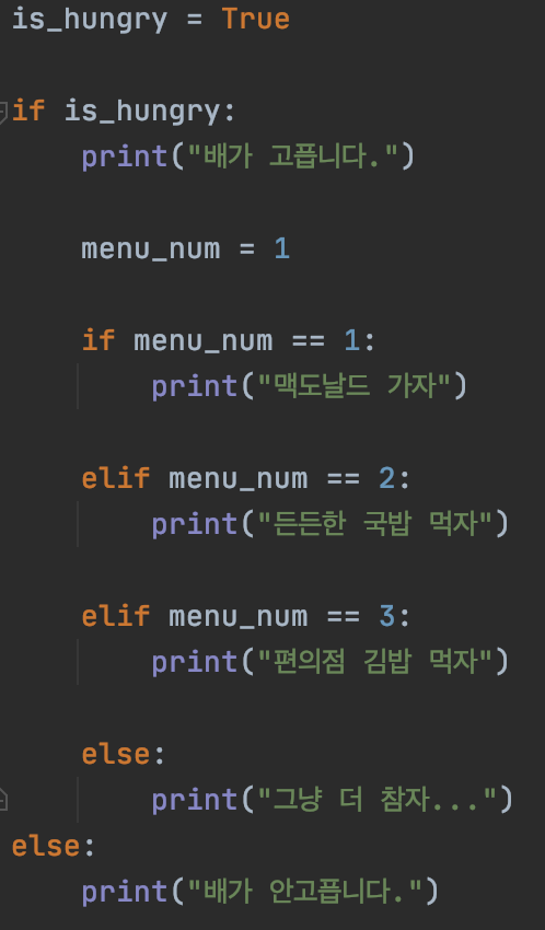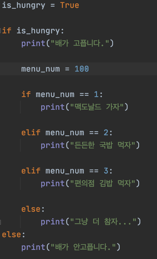 이번에는 is_hungry가 True이므로, 배가 고프다가 출력이 되고 그 안에서 한 번 더 조건문을 넣어서 변수 menu_num에 따라서 무엇을 먹을지가 달라진다. 조건문 안에 또 조건문을 넣은 구조이다.