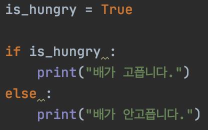 변수 is_hungry가 True인지 False인지에 따라서, if아래가 실행되거나 else 아래가 실행된다.